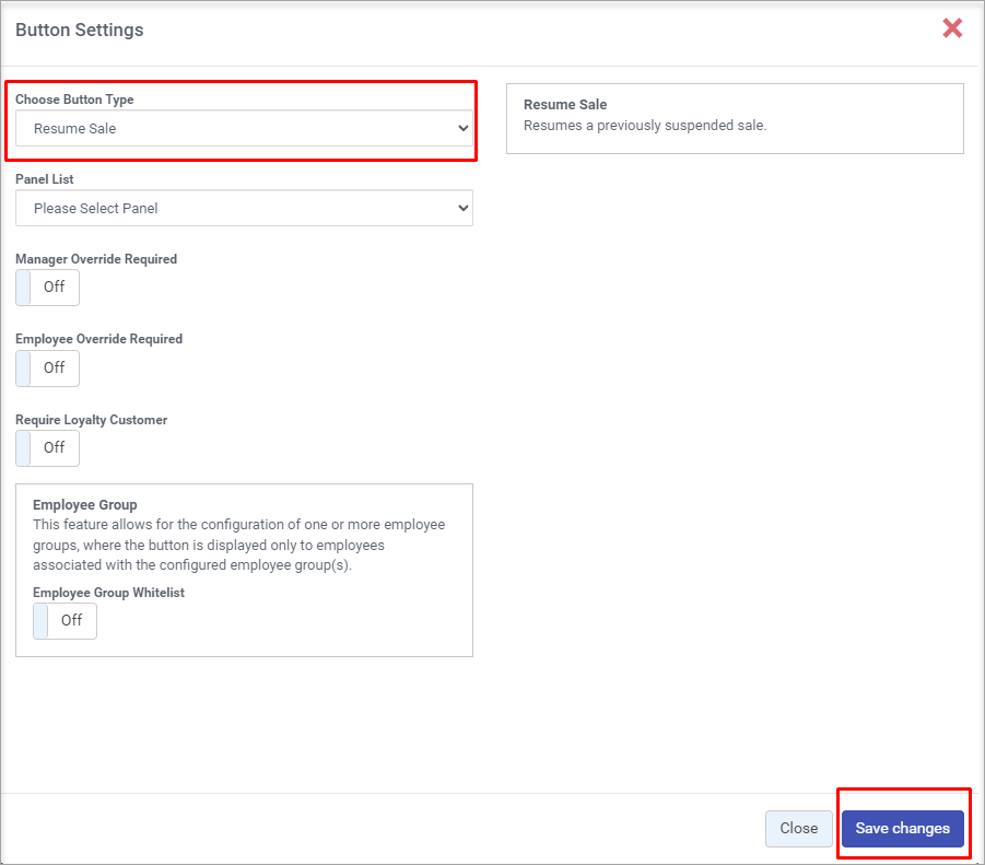 2. Resume Sales Button Settings: Choose the button type as Resume Sales from the drop-down list.