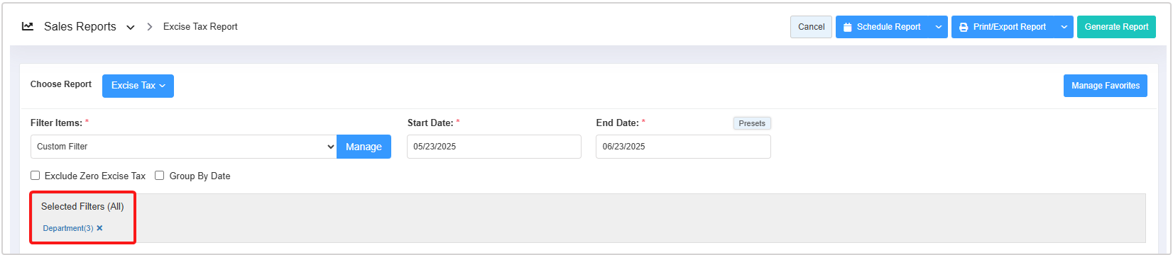 The Filter Items filter lets you view the report based on a selected parameter from four options: Department, Manufacturer, Vendor, and Department Tag. This means you can access the Excise Tax Report for the selected parameter, i.e., departments, vendors, or any other parameter.