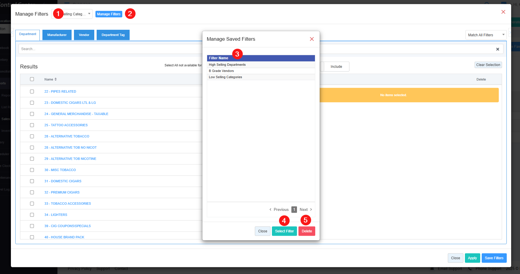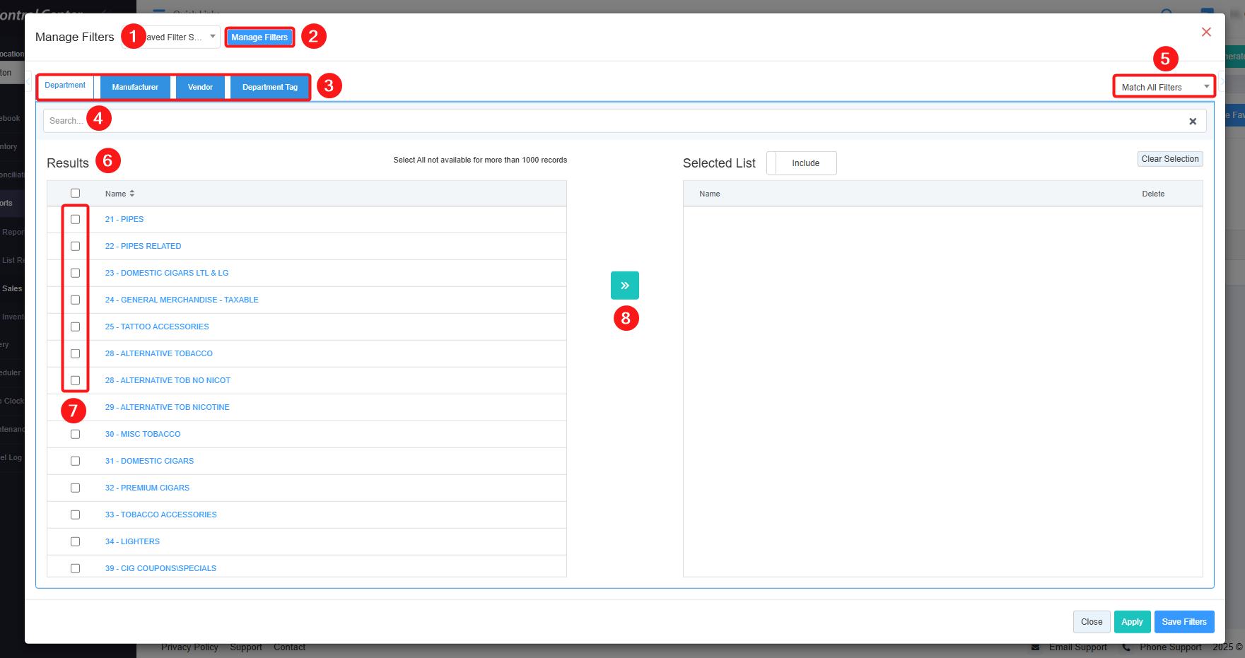- 5: Match All Filters Drop-Down: The Match All Filters filter has two options, "Match All Filters" and "Match Any Filters." Select either option to determine whether the Manage Filter screen data matches all applied filters. This drop-down is particularly useful when you use multiple parameter tabs, such as when you choose a few departments from the "Department" tab and a few vendors from the "Vendor" tab.