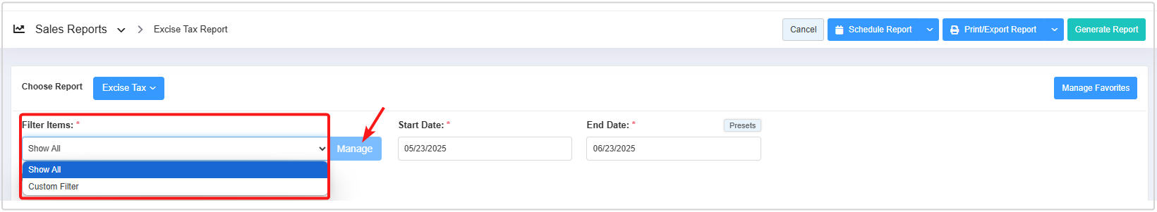 - 1: Saved Filters Drop-Down: Select the saved custom filters from the Manage Filters drop-down (if any) and click "Apply" to apply the saved custom filter. The system will redirect you to the Excise Tax Report home screen. Click "Generate Report" to generate the report for the selected filter.