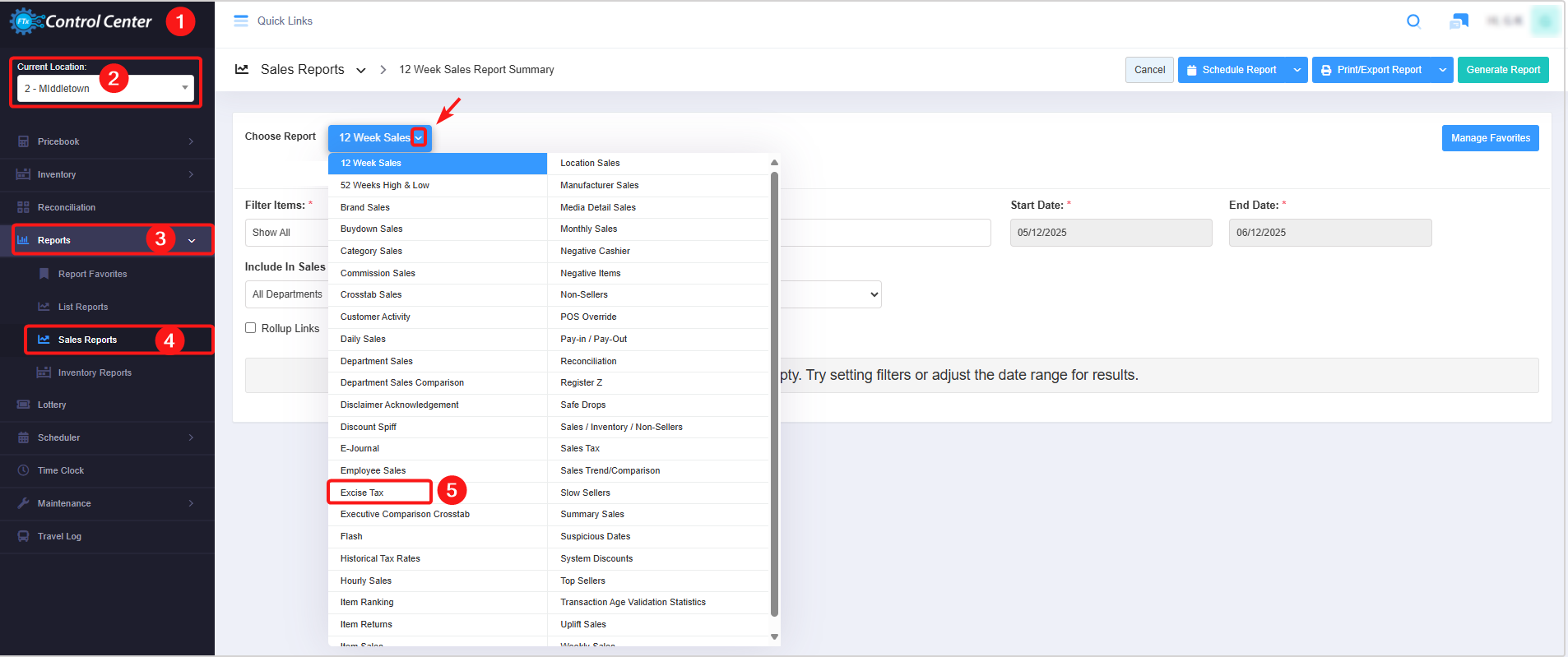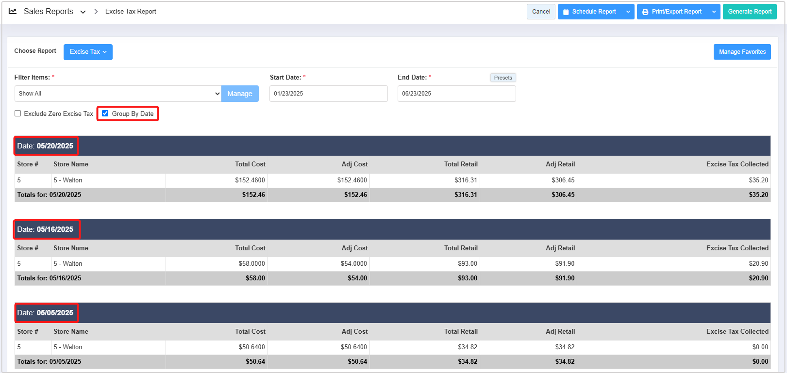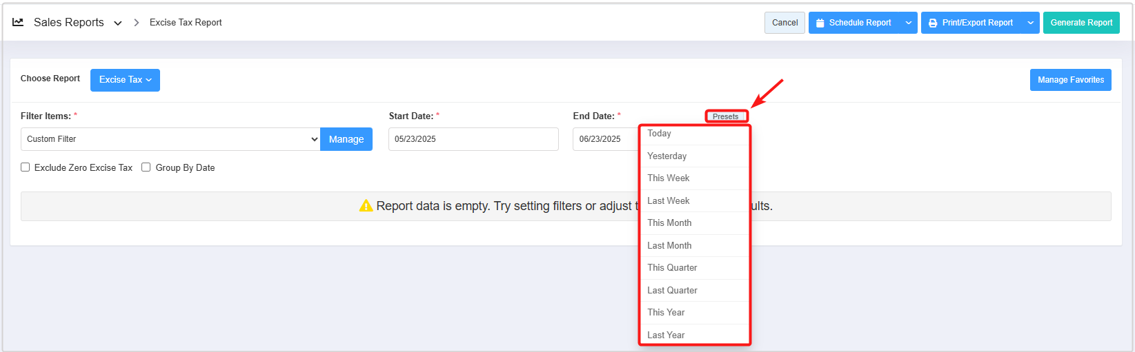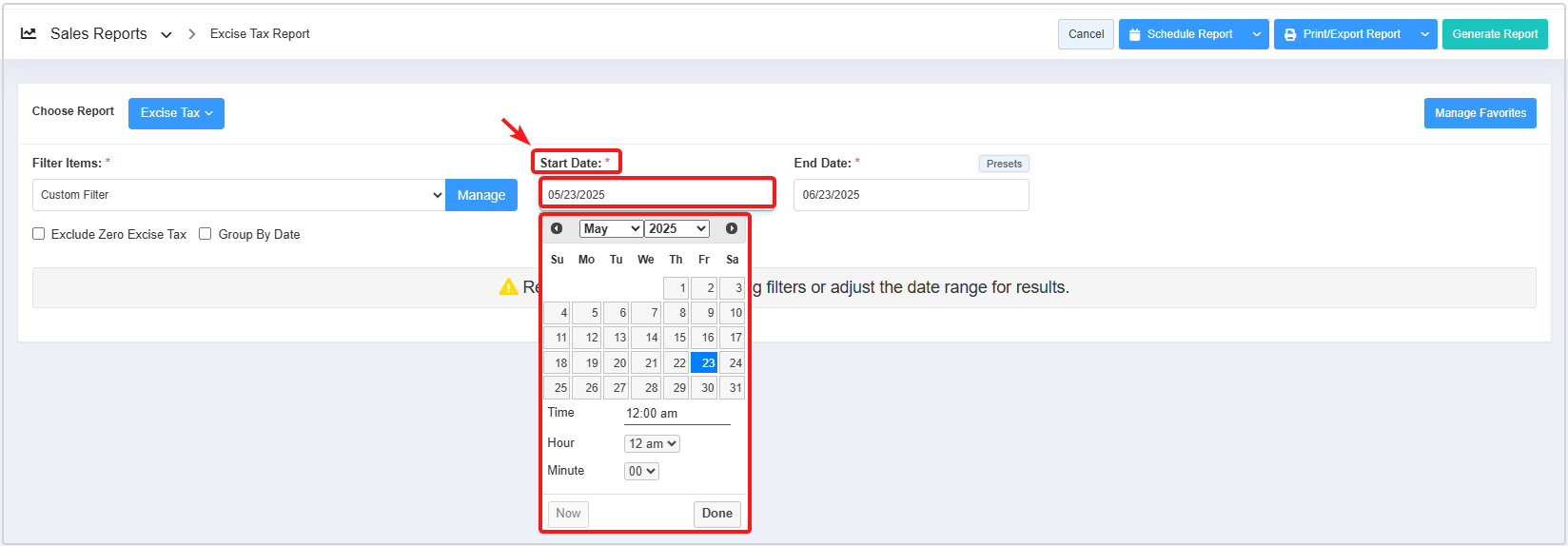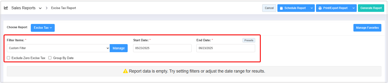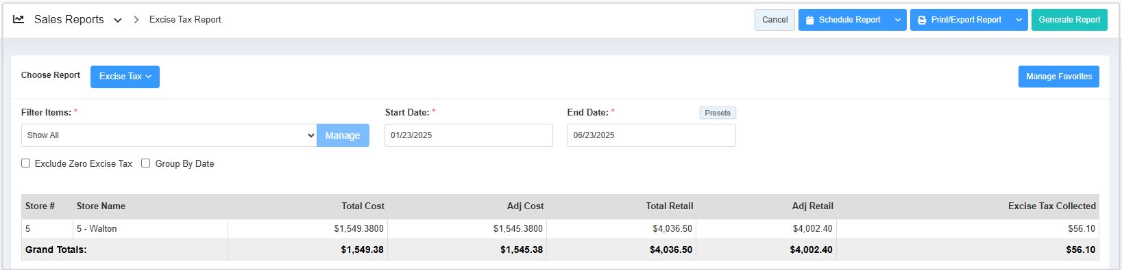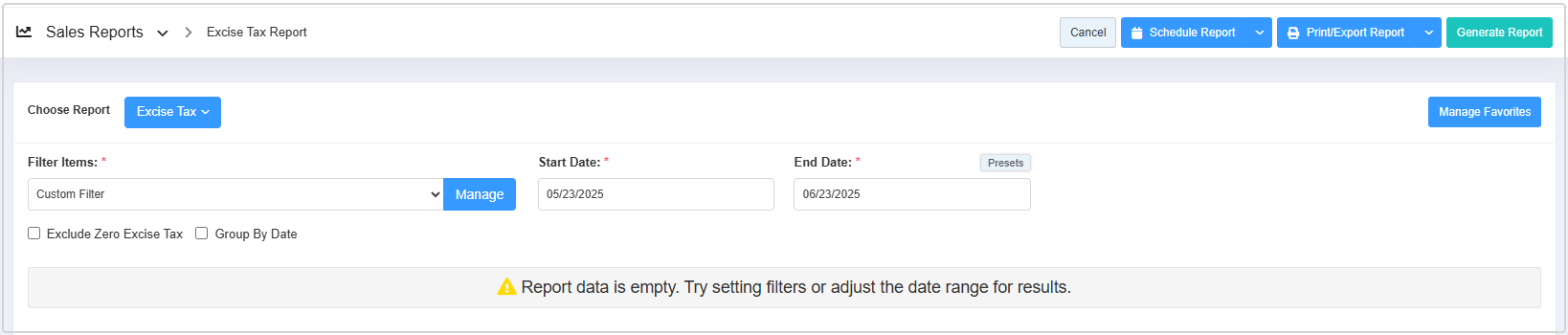 - Select the date range and click "Generate Report" to view the "Excise Tax Report" for the selected date range.
