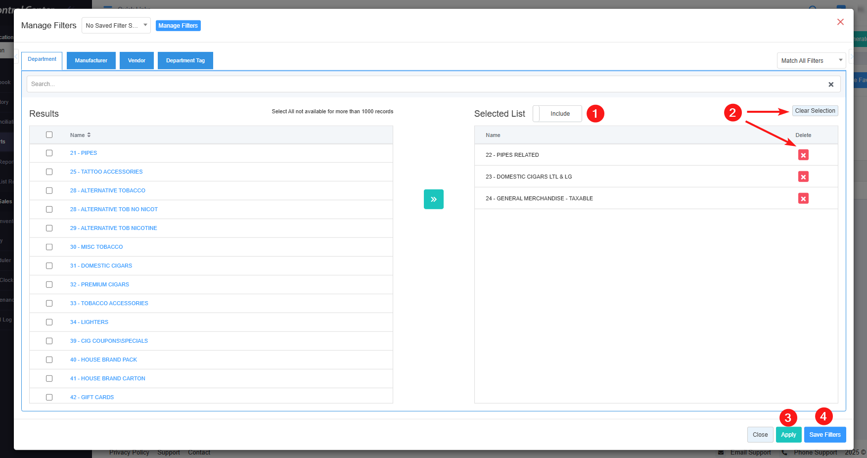 - 3: Parameters Tabs: You will see four tabs: Department, Manufacturer, Vendor, and Department Tag. Select the required tab, i.e., "Department," to create or apply a custom filter specific to the selected departments.