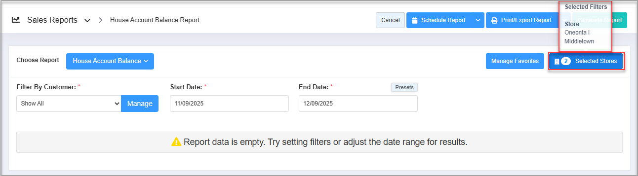 The Filter Stores and Locations option enables you to refine report data by selecting specific stores or store locations. This helps you view accurate, location-specific information instead of combined data for all stores.