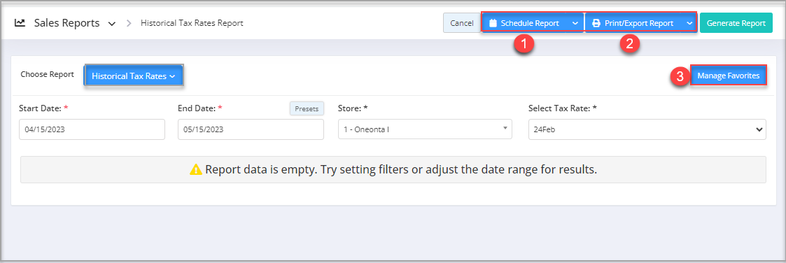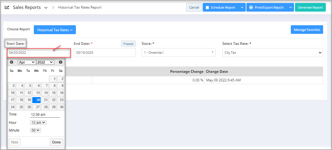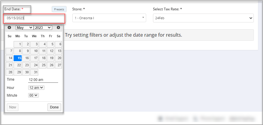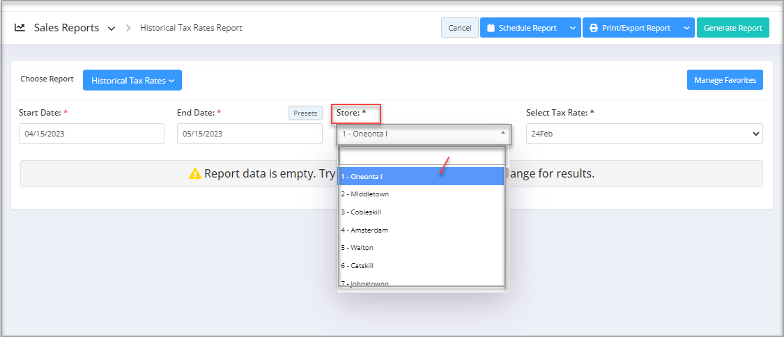 When you navigate to the page, you will see the options pre-selected by default. You can generate the historical tax rate report for the selected date range and for the selected store.