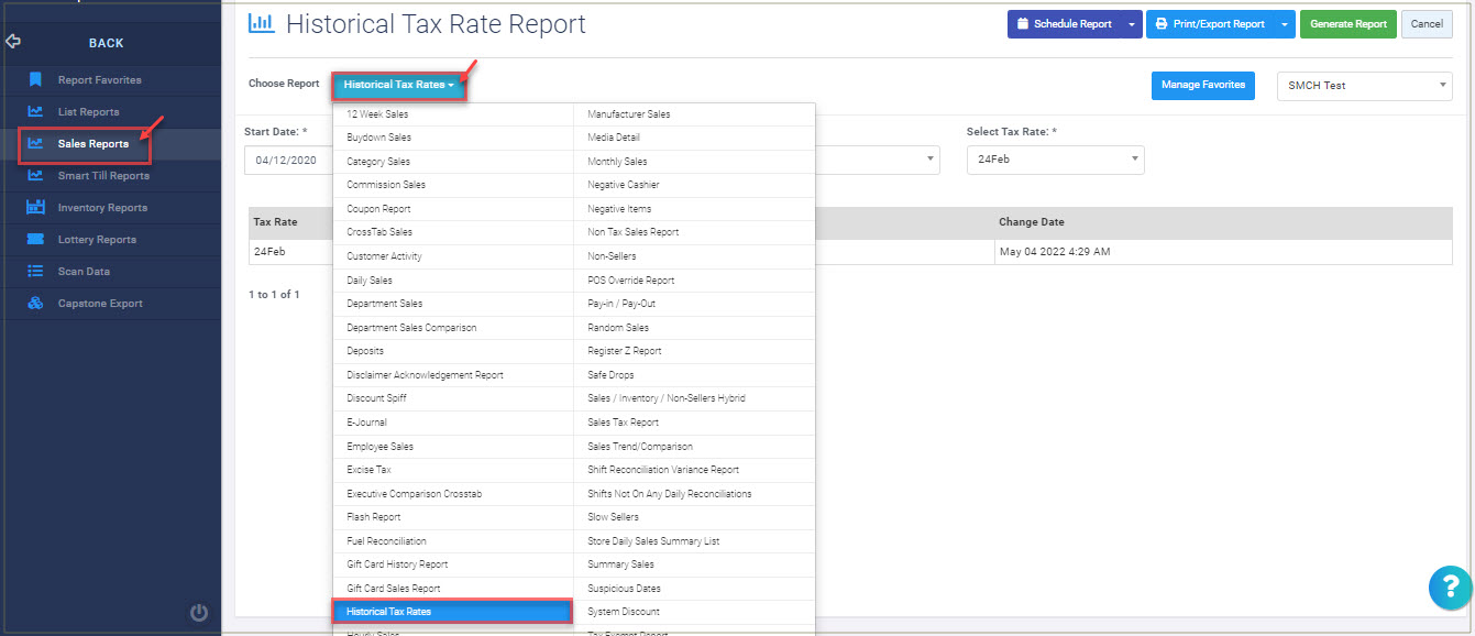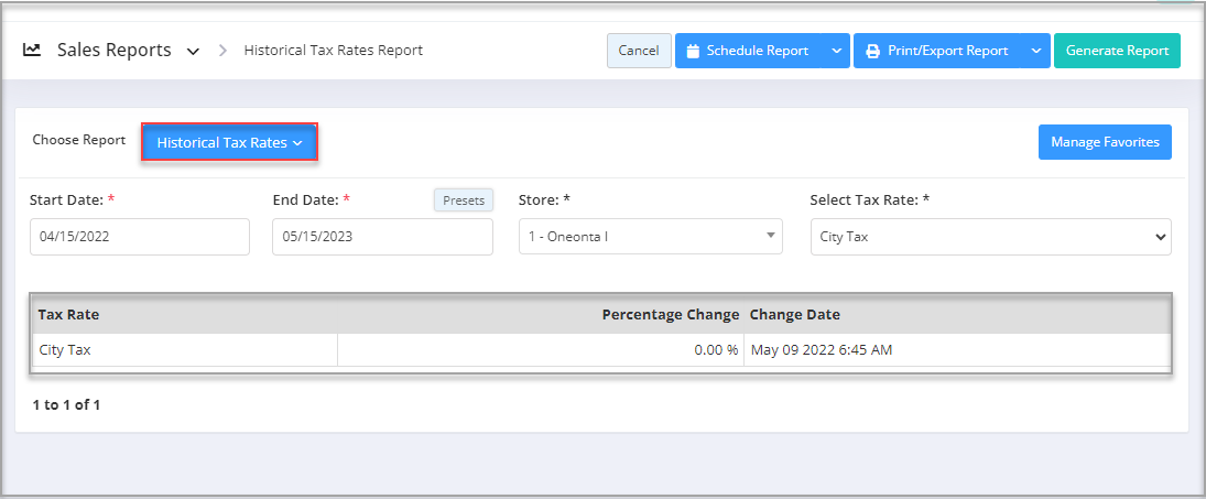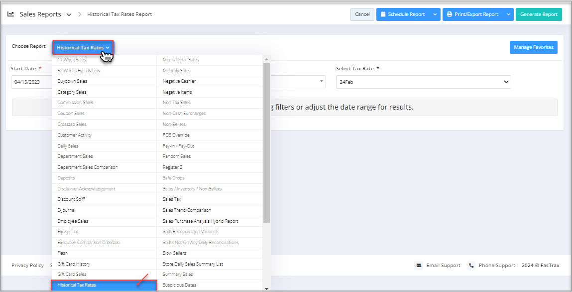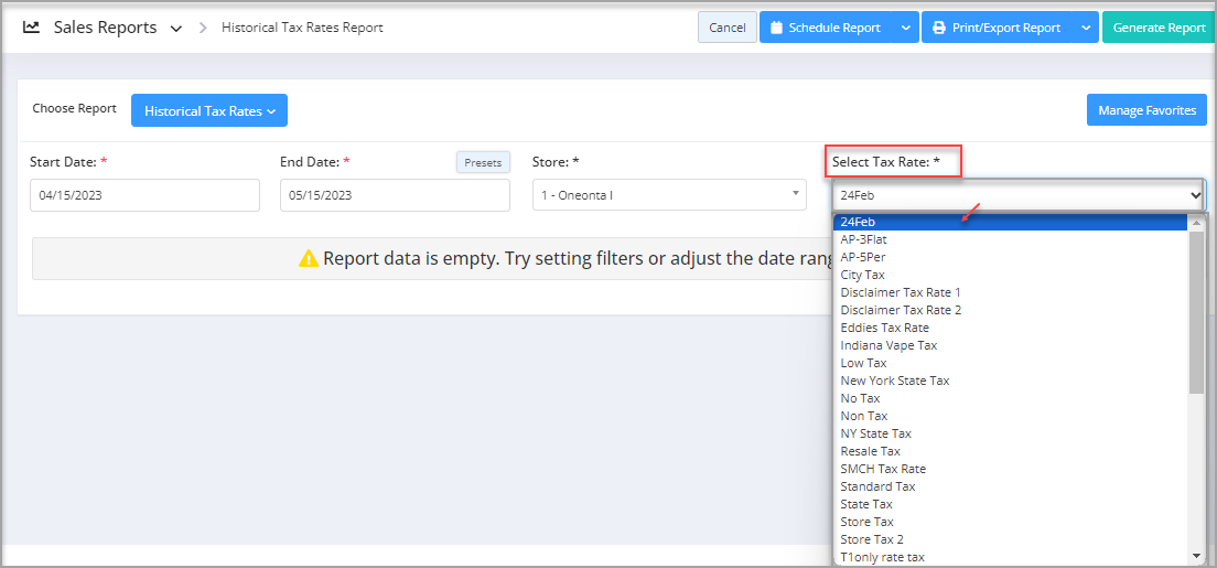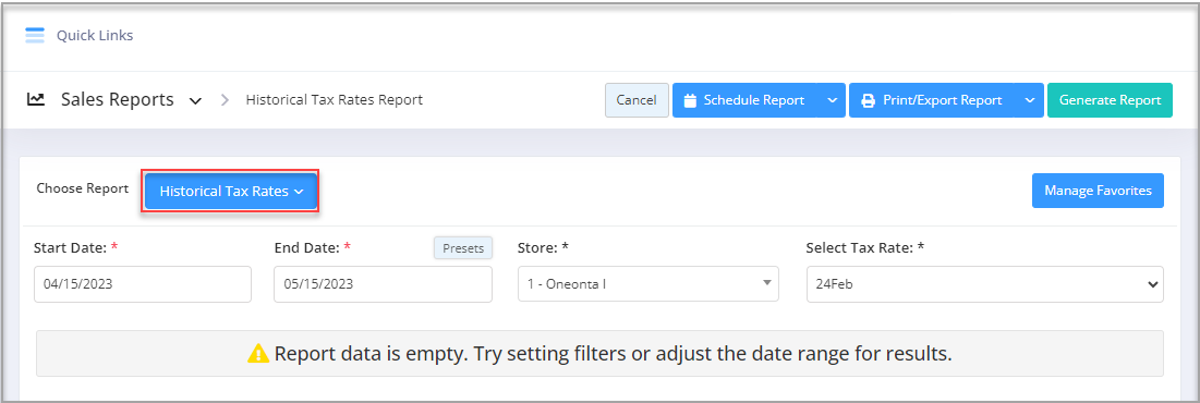 By clicking "Historical Tax Rates," you will be redirected to the "Historical Tax Rate Report" page with relevant filtering and sorting options.