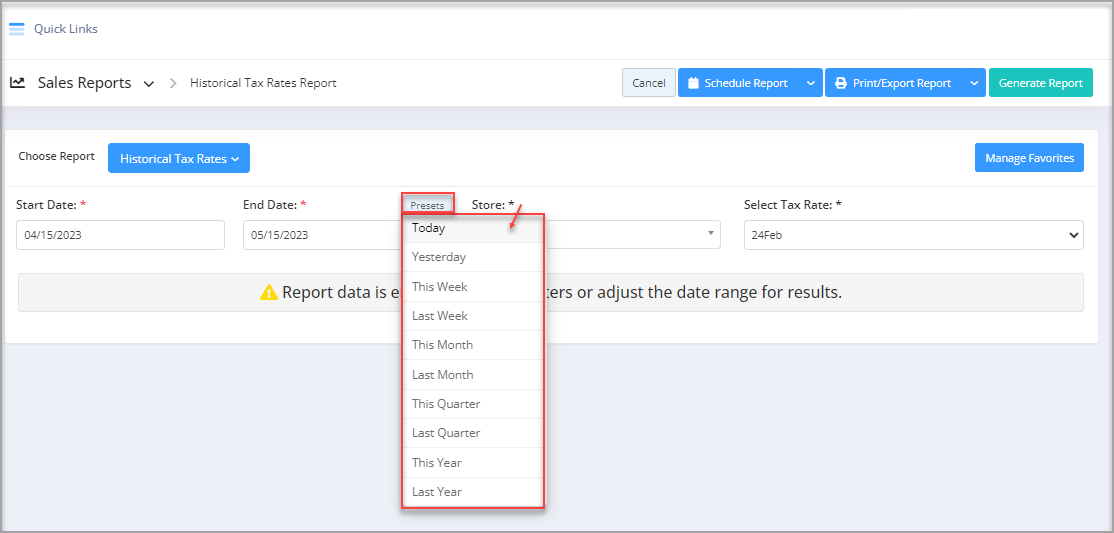 You can generate the report by choosing the desired date range, presets, store, and tax rates, and clicking on "Generate Report" to generate the Historical Tax Rates Report.