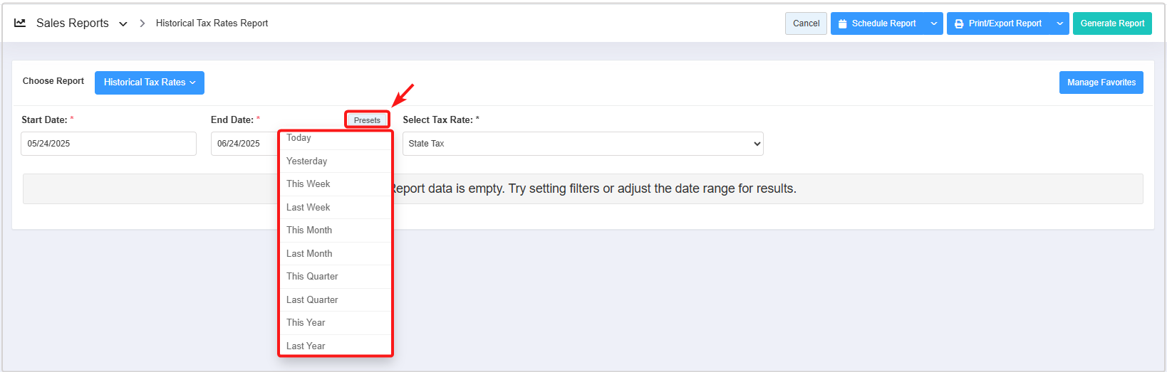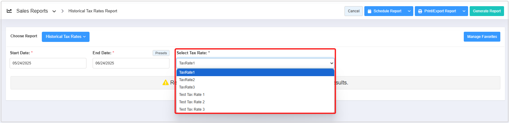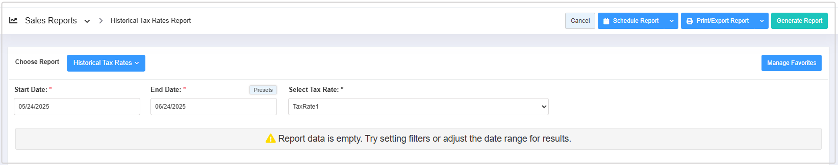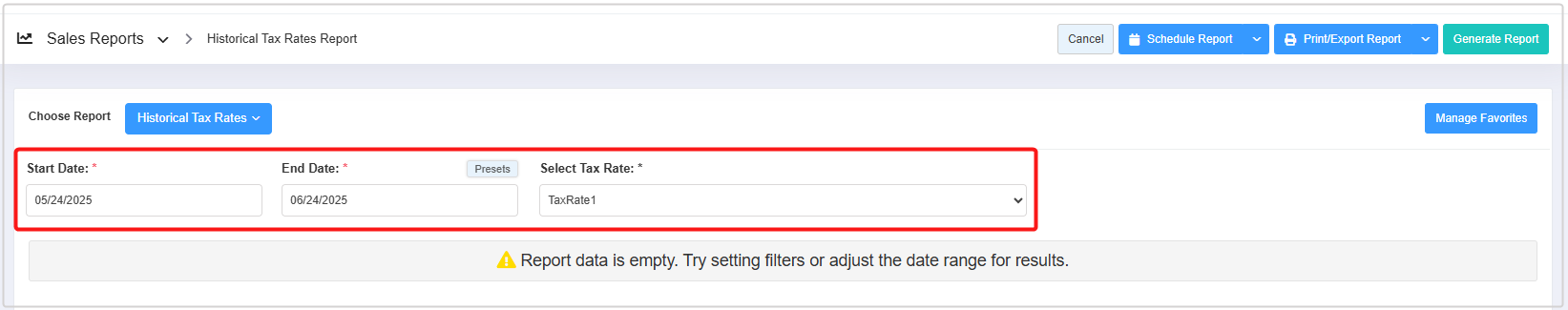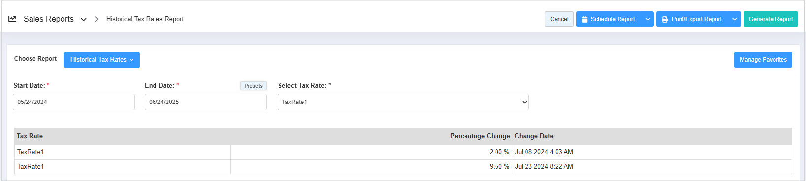 Historical Tax Rates Report Overview The "Historical Tax Rates Report" provides a record of past tax rate changes within the selected date range. Users can apply various filters based on their requirements. The report displays details such as the tax ...