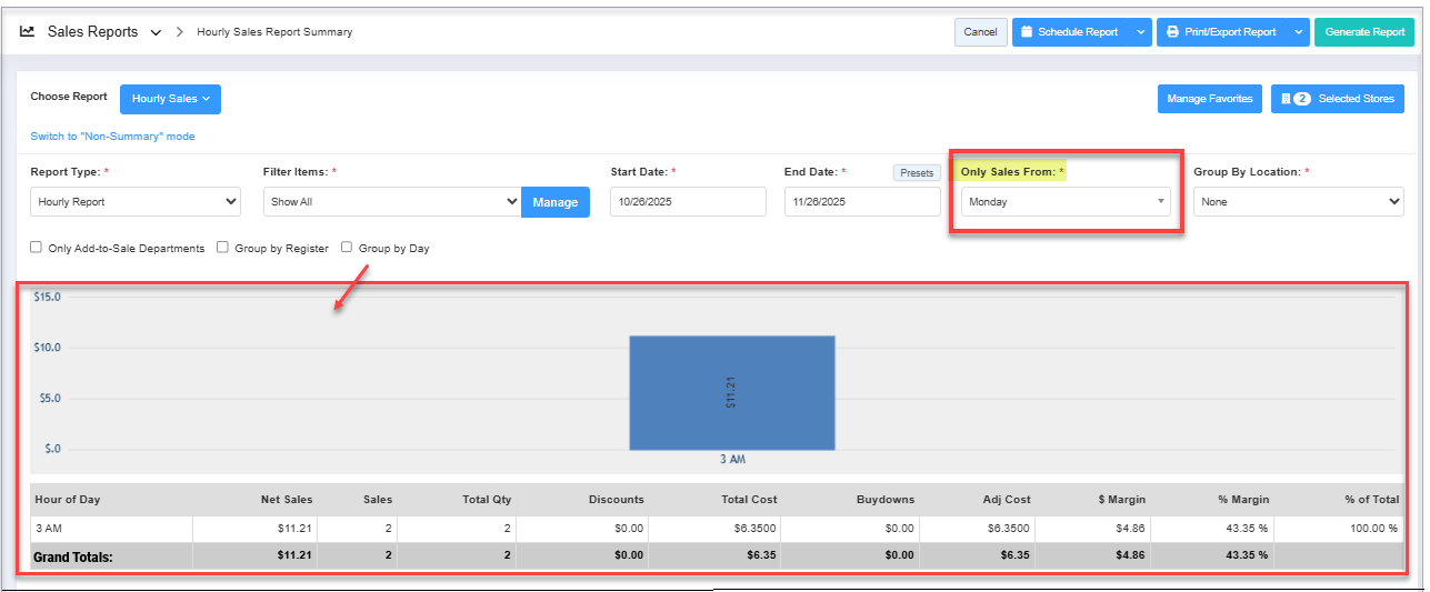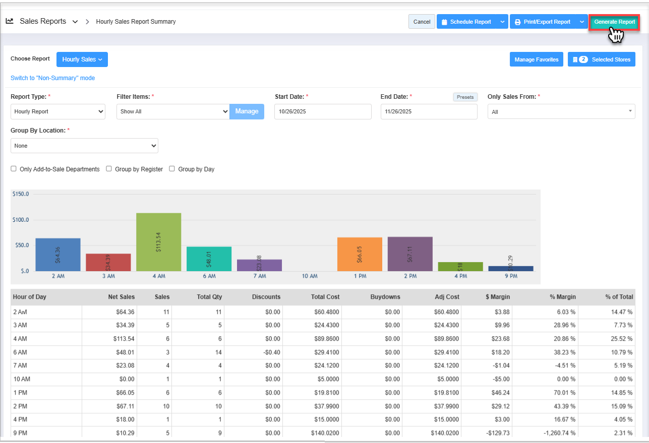 - Select the date range and click "Generate Report" to view the "Hourly Sales Report" for the selected date range.
