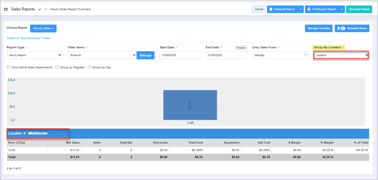 - By Location Group(s): This option will group the sales data in a report on an hourly basis according to the predefined location groups.