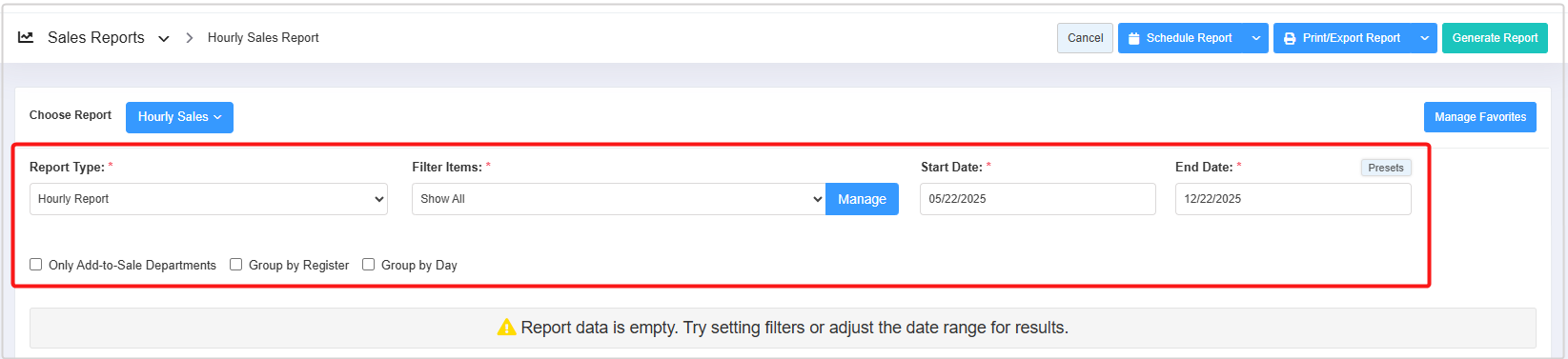 FTx Cloud POS lets you view the Hourly Sales Report records according to your preferences using various filter options. As highlighted in Figure 3.1, you can configure the report with any single filter or combination of multiple filters.