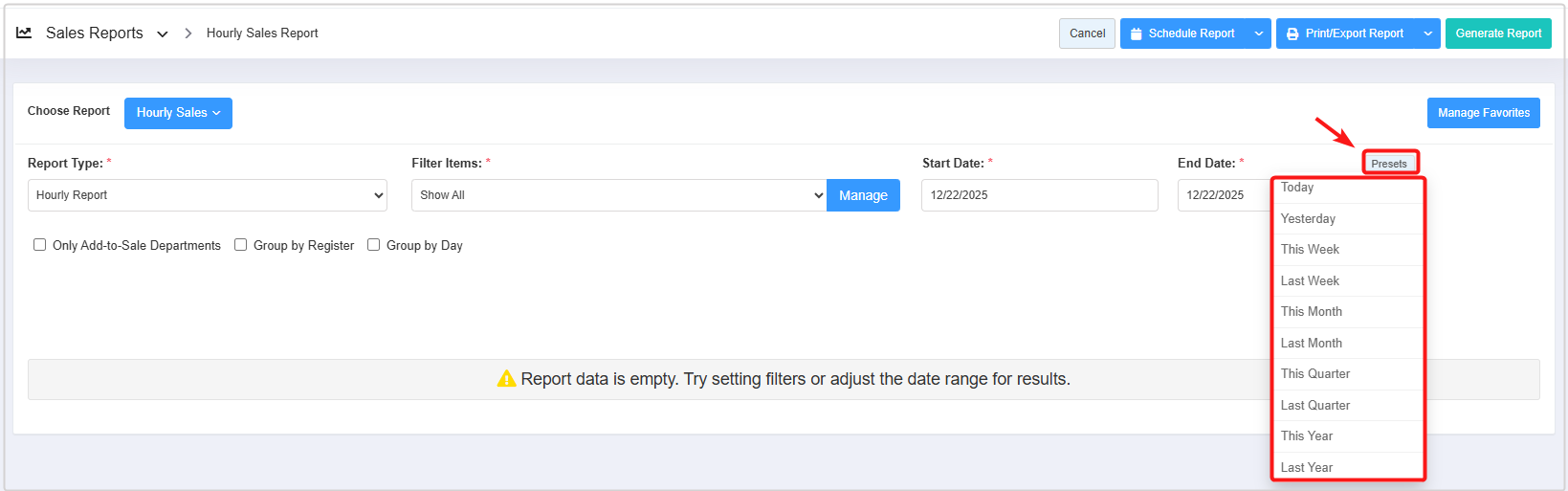 - You can use the Report Type, Filter Items (Custom Filters), Date Range & Presets filters, and Only Add-to-Sales Departments, Group by Register, and Group by Day checkbox filters to create the report that meets your requirements. You can use multiple filters to make the report more specific. Please refer to point 3. Report Filter Options, to learn more about these filters.