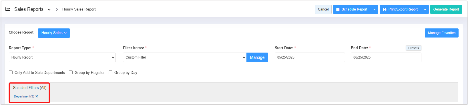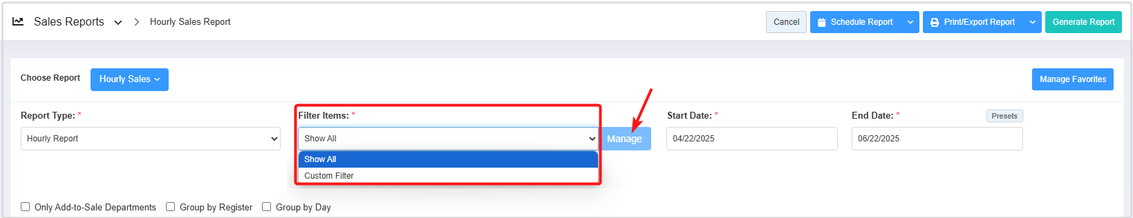 - Filter Items: The Filter Items (Custom Filters) filter lets you view the report based on a selected parameter from five available options: Department, Category, Manufacturer, Tag, and Department Tag. This means you can access the Hourly Sales Report for the selected parameter, i.e., departments, tags, or any other parameter. For further details, refer to Section 3.2 Filter Items (Custom Filters).