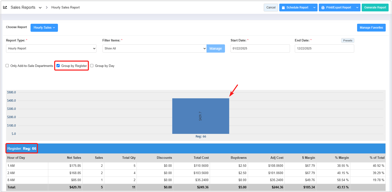 - Group By Register: If you tick this checkbox when generating the report, the system will organize the report records based on the Register number on which the sales were performed. 3.5 Checkbox Filters explains further details.