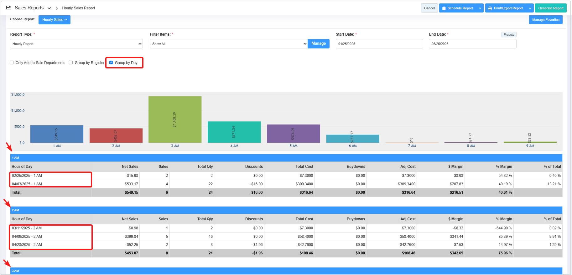 - Group by Day: If you tick this checkbox when generating the report, the system will organize the report records based on sales days. 3.5 Checkbox Filters explains further details.