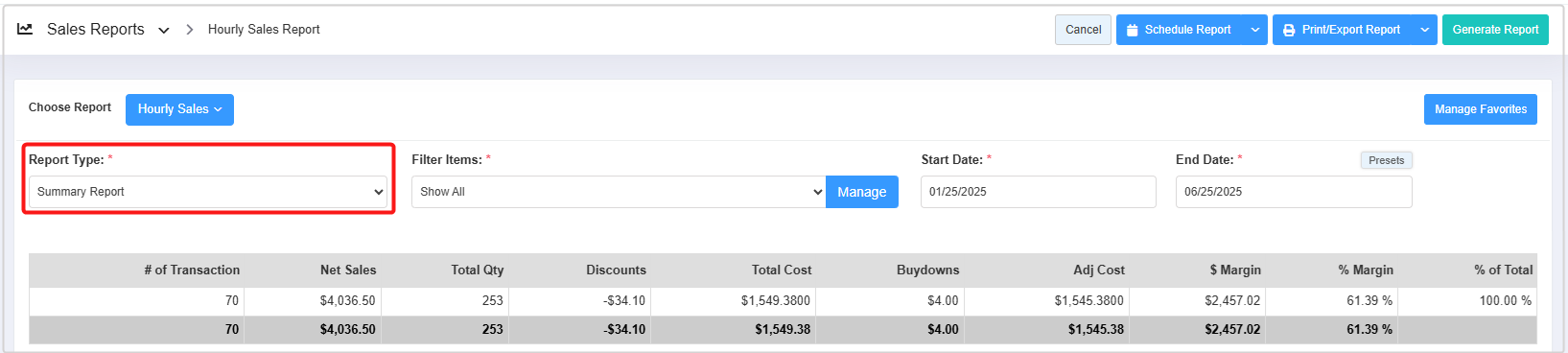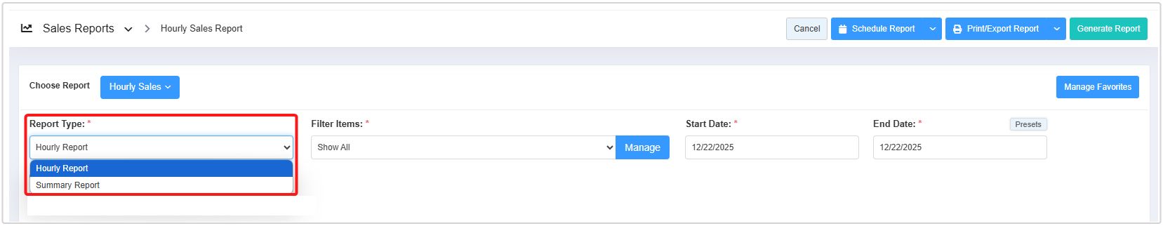 The Report Type filter lets you view the Hourly Sales Report based on two parameters: Hourly Report and Summary Report.