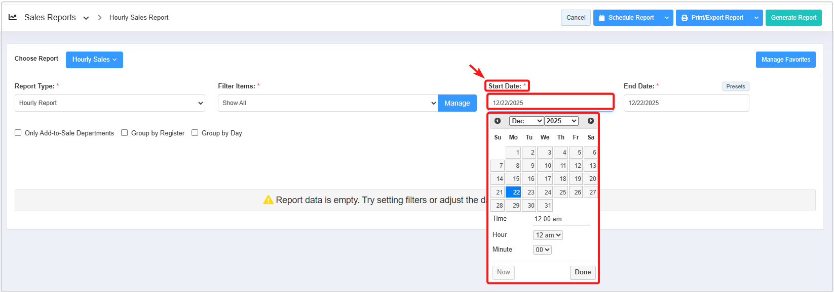 - Select the date range and click "Generate Report" to view the "Hourly Sales Report" for the selected date range.