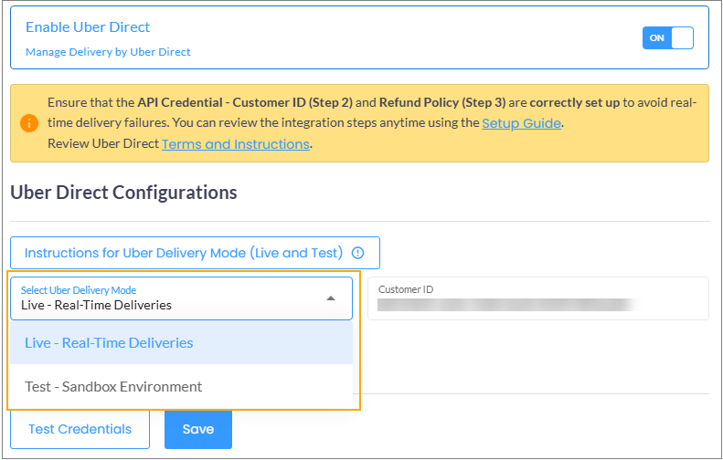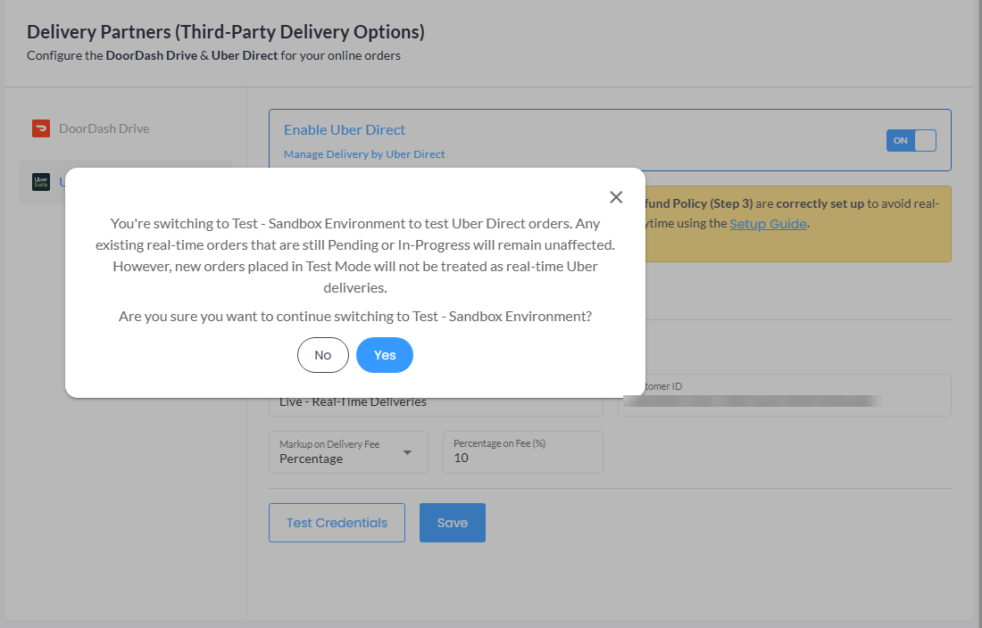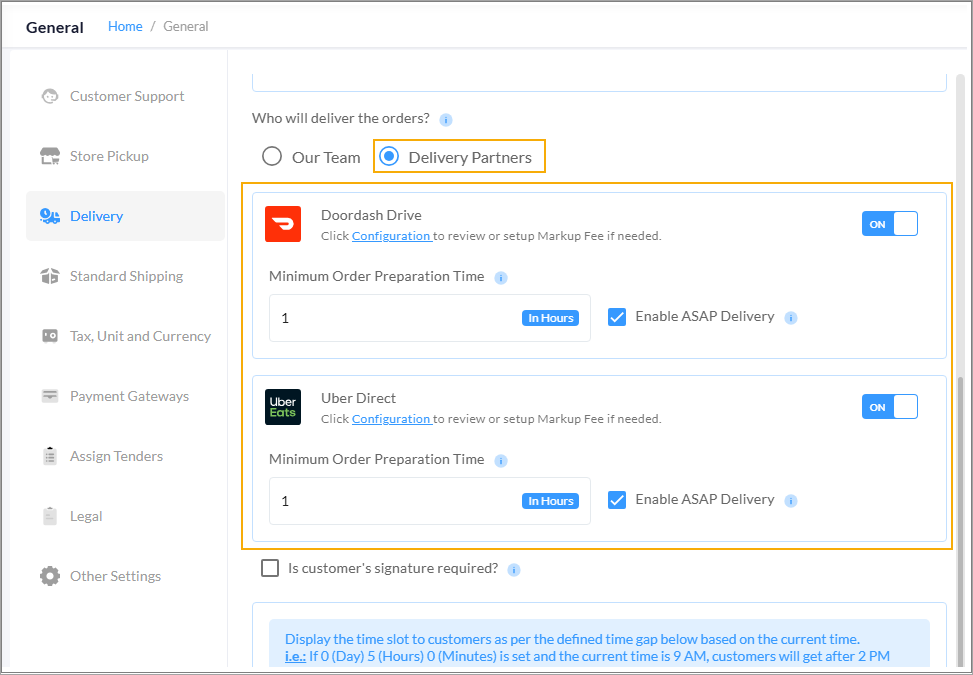 - Enable ASAP delivery: For each delivery partner, you can enable the ASAP Delivery option to allow customers. When enabled, this allows customers to place orders for immediate delivery. The delivery partner (DoorDash or Uber Direct) will assign the nearest available driver to pick up the order as soon as possible.