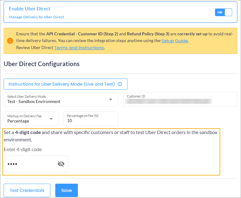 - Enter the code to unlock the Uber Direct Sandbox Environment.