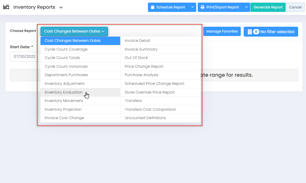 Once the specific records are selected from the filter options (tabs), you can generate the Inventory Evaluation report by clicking the "Apply" button and then the "Generate Report" button from the main page.