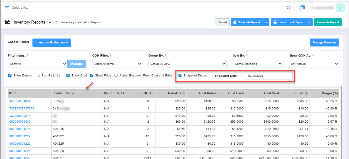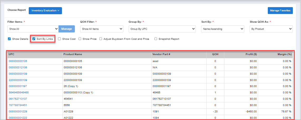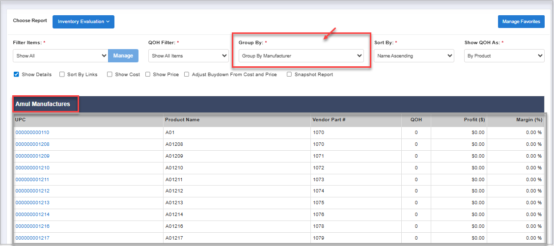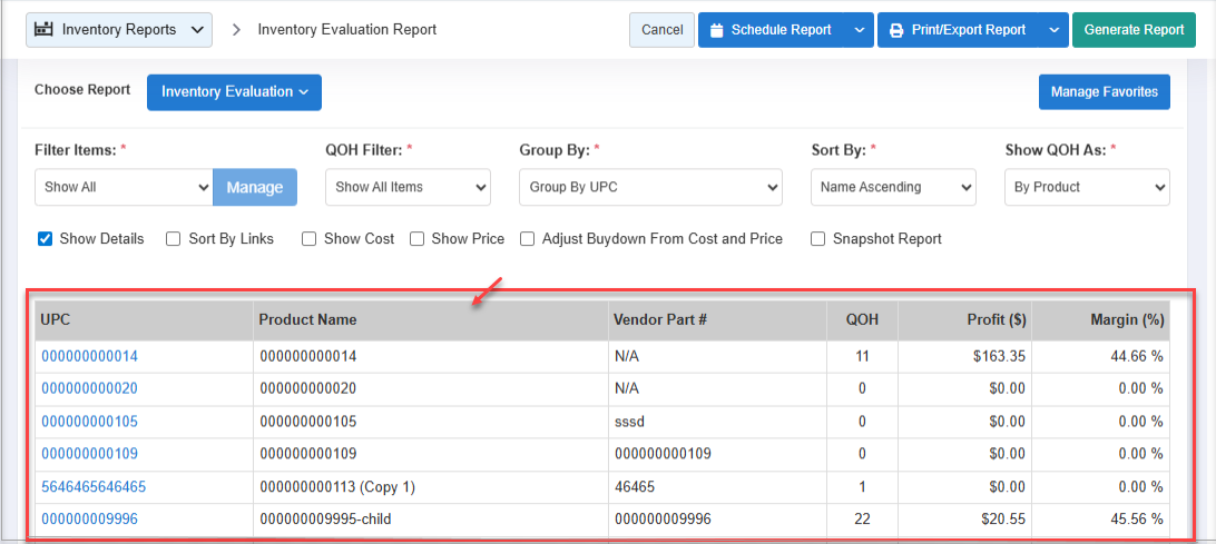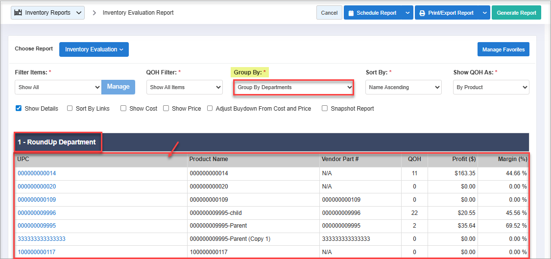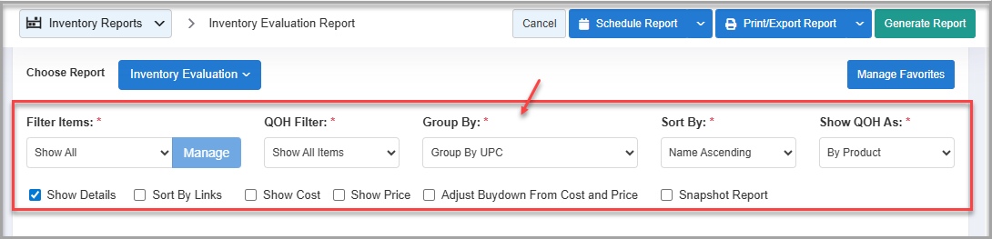 1. Group By UPC: When you generate the Inventory Evaluation Report, by default, it will be generated with the "Group By UPC" pre-selection. The report will show the UPC (item)-wise sales data.
