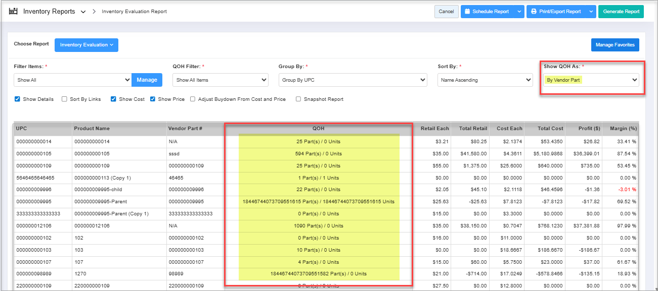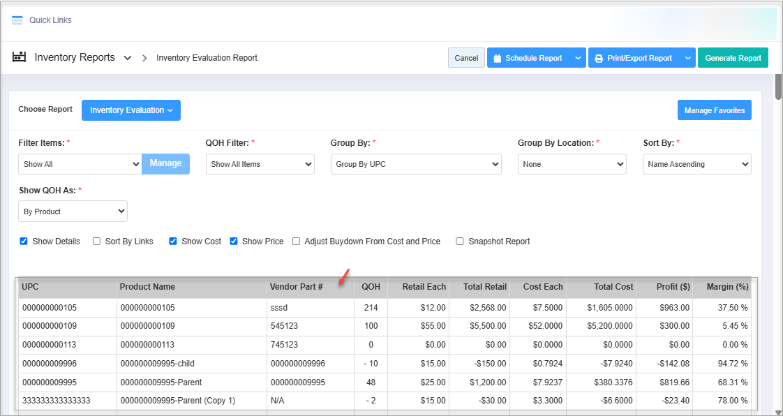 You will see the Vendor Part Num, Available Stocks (QOH), Profit ($), and Margin (%) in the Inventory Evaluation report.