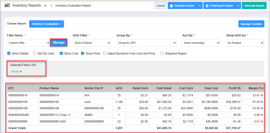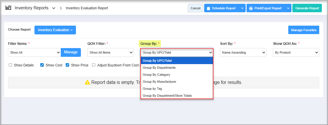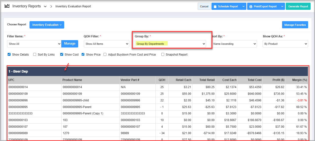 1. Group By UPC: When you generate the inventory Evaluation report, by default, it will be generated with the "Group By UPC" pre-selection. The report will show the UPC (item)-wise sales data.