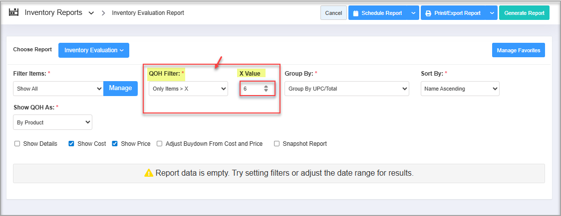 - Only Items > X: Selecting this option will generate a report displaying items with Quantity on Hand (QOH) values greater than the amount you specified. In this example, it will show the items that have QOH > 6.