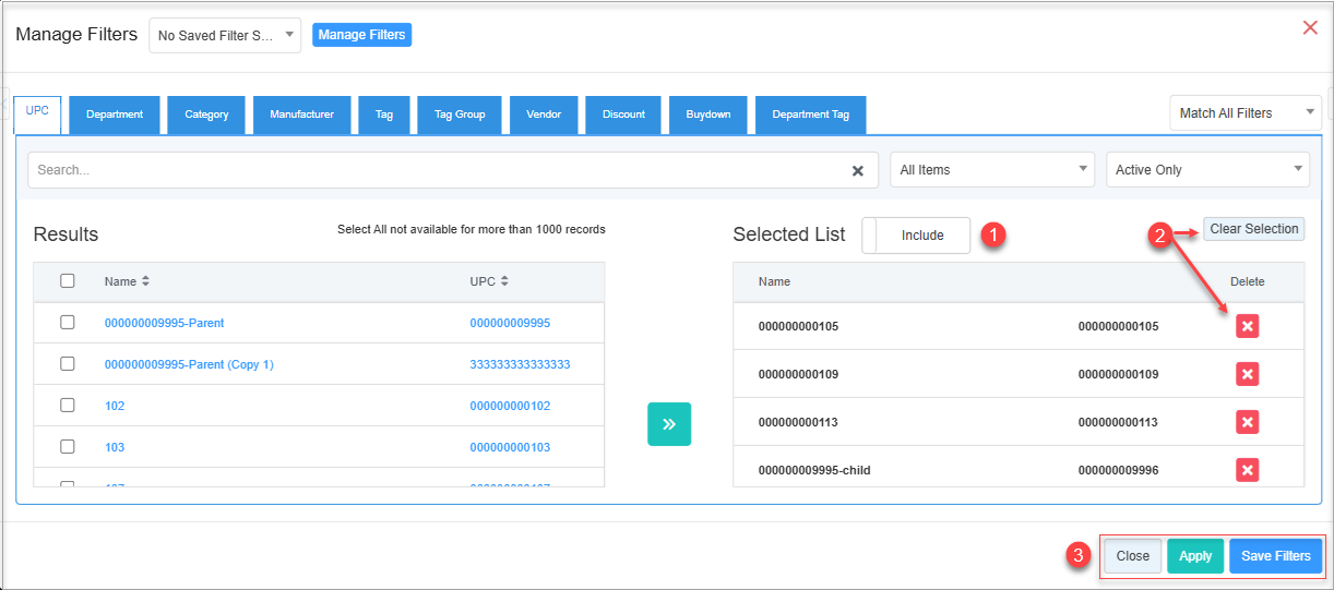 2. Parameter Tabs: You will see the following tabs: UPC, Department, Category, Manufacturer, Tag, Tag Group, Vendor, Discount, Buydown, and Department Tag. Select the required tab, i.e., "UPC," to create or apply a custom filter specific to the selected UPCs.
