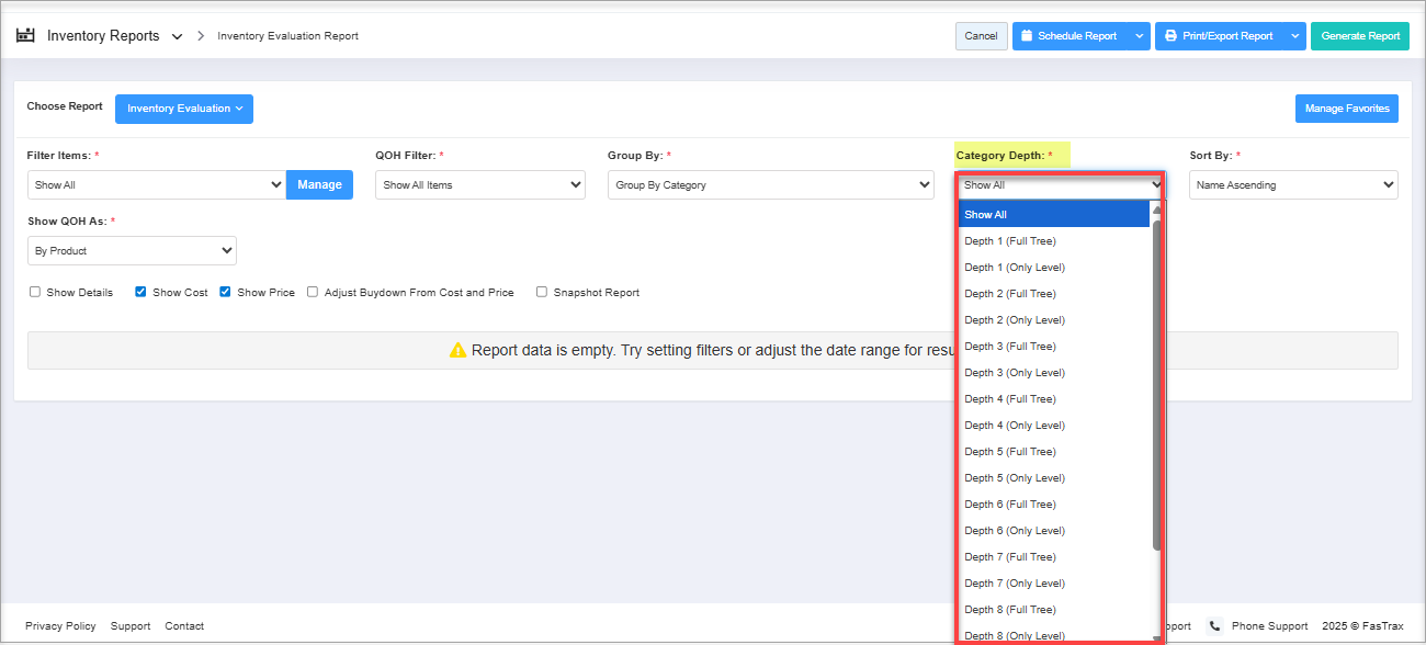 Category Depth: When you select "Group By Category," this drop-down option will be enabled. This drop-down option lists the level (depth) of the categories. So, by selecting the specific depth, the inventory Evaluation report will display only the inventory data under the selected depth (level).