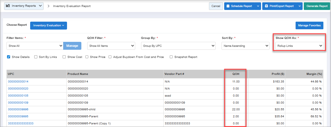 Rollup Links: This filter will merge the related parent and child items to give you the total quantity on hand of the product in decimal format.