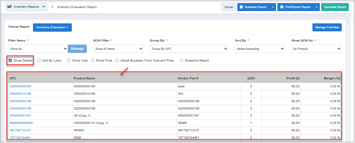 Tick the "Show Details" checkbox to display the products on the list. By ticking the "Show Details" checkbox and generating the report, you will see the products with extra details such as product name, vendor part, cost, price, etc., in the Inventory Evaluation Report.