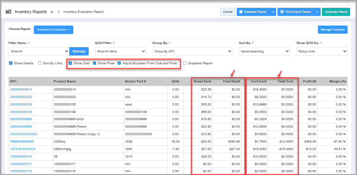 - Before enabling the "Adjust Buydown From Cost and Price" checkbox, you can see the applicable cost and retail price for each product in the Inventory Evaluation Report.