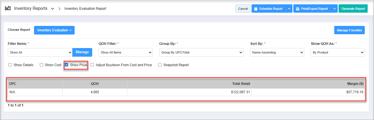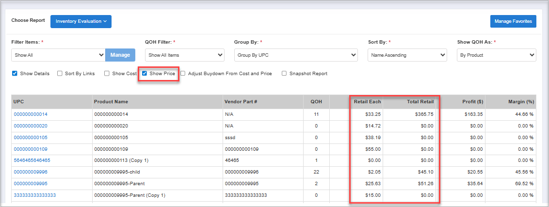 Tick the "Show Price" checkbox to check the retail price of each product. By ticking the "Show Price" checkbox and generating the report, the two columns, Retail Each and Total Retail, will be displayed in the Inventory Evaluation Report.