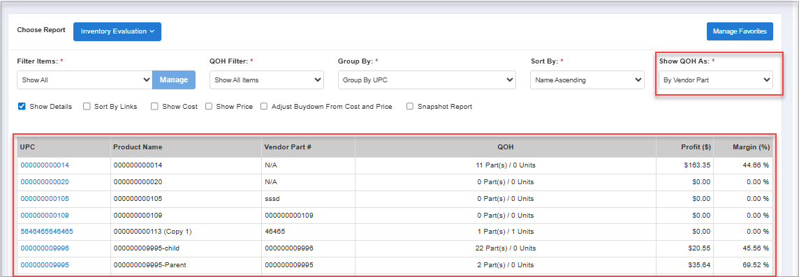 You will see the Vendor Part Num, Available Stocks (QOH), Profit ($), and Margin (%) in the Inventory Evaluation Report.