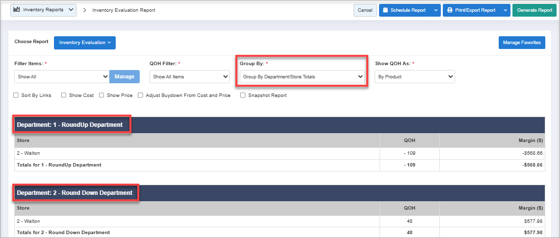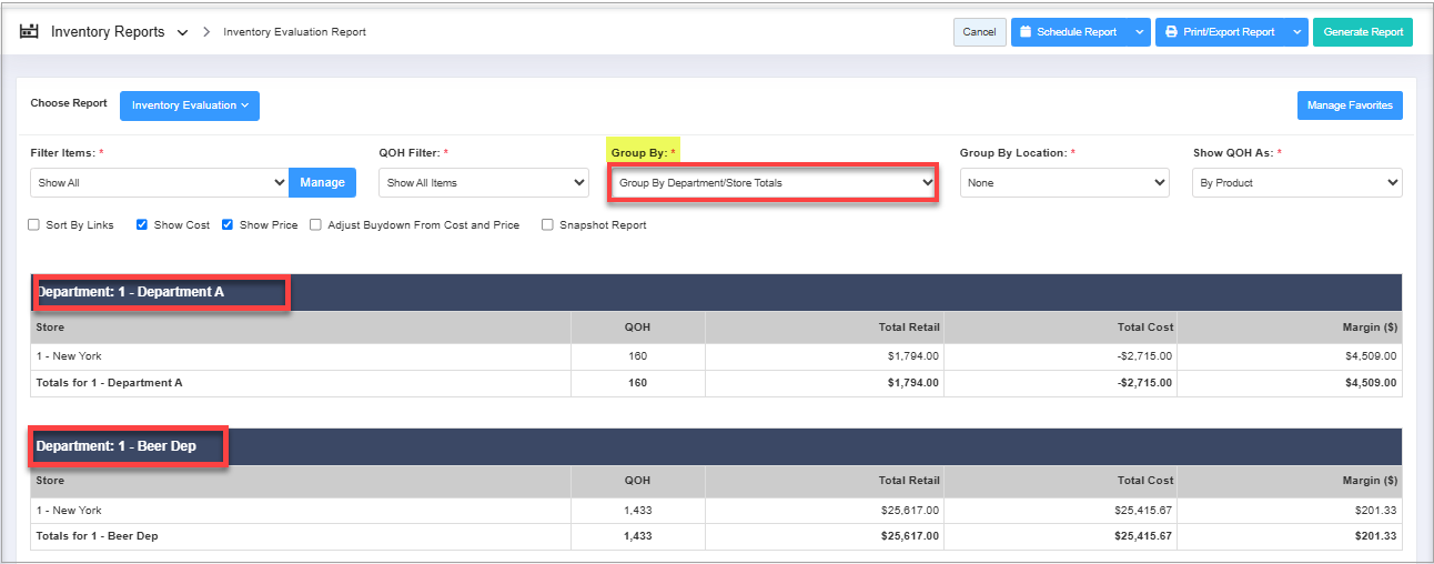 2. Group By Departments: If you select "Group By Departments," you will see the department-wise inventory data in the report. Items in the same department will be displayed under their respective department when generating the Inventory Evaluation Report.
