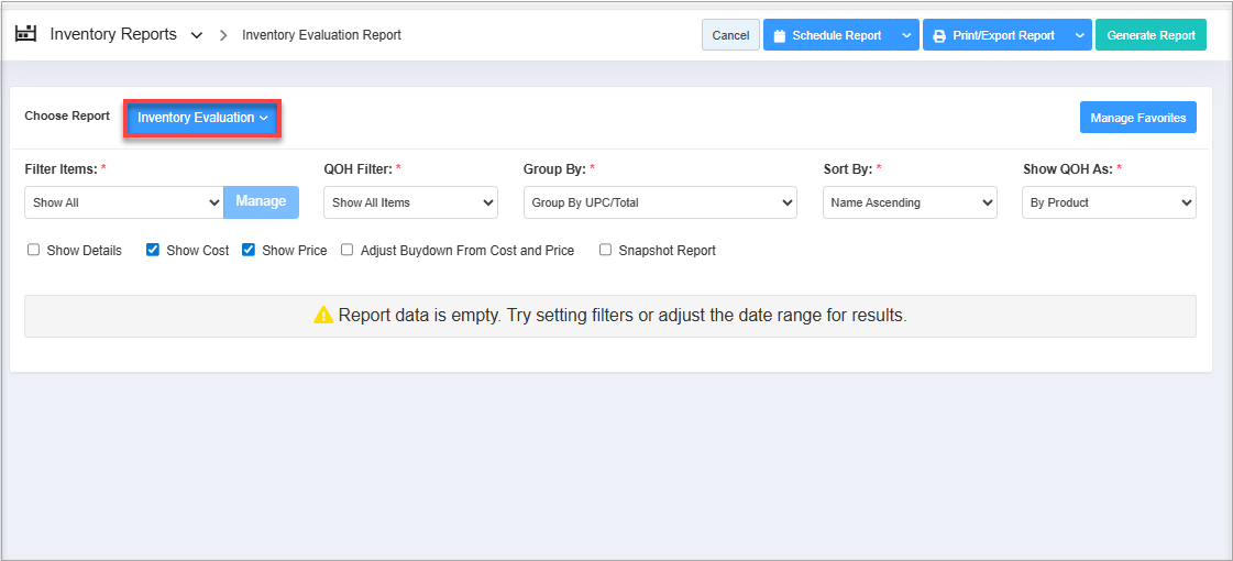 - The system will redirect you to the Inventory Evaluation Report home screen.