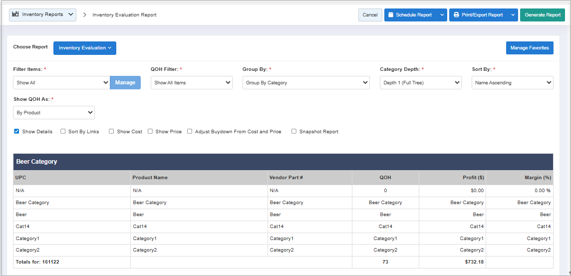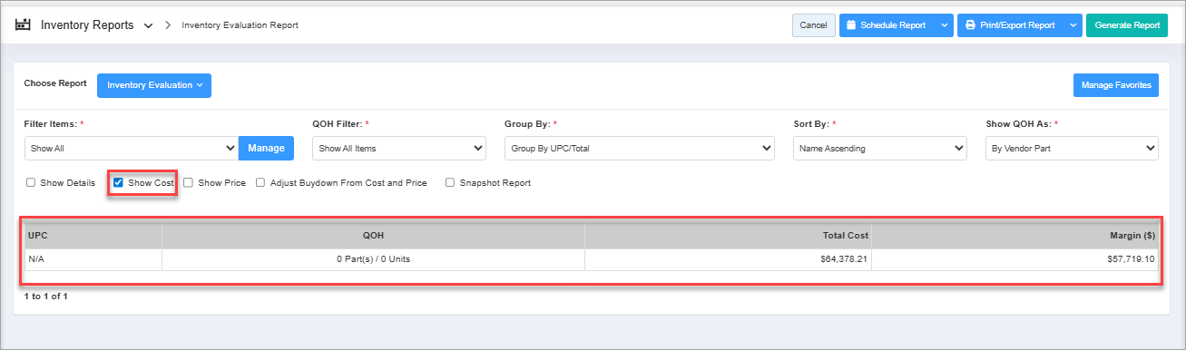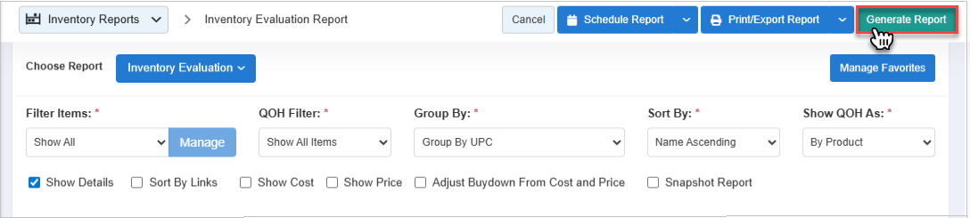 - Inventory Evaluation Report Options: Filtering and bifurcation options are available for the Inventory Evaluation Report.