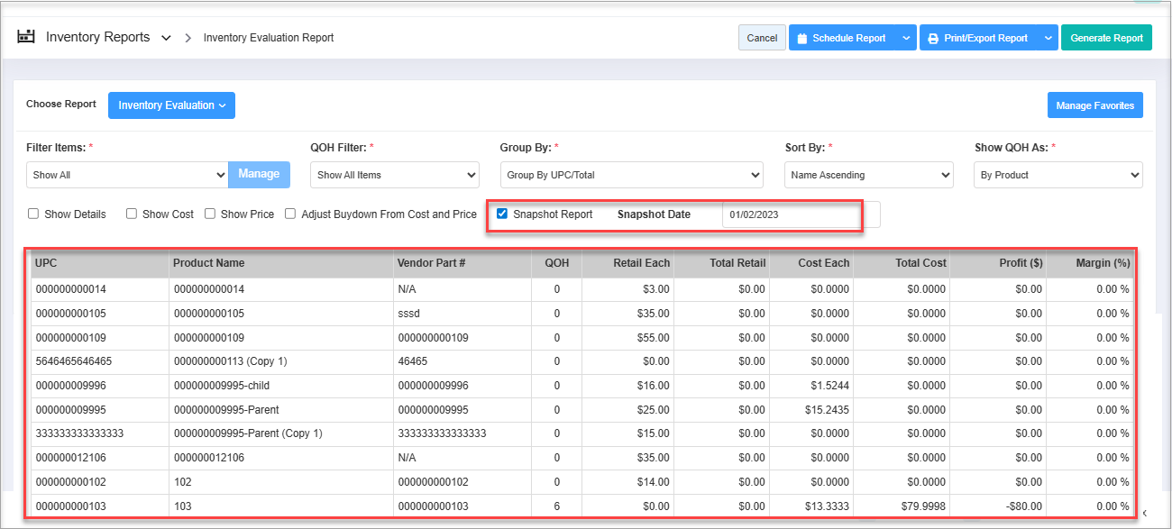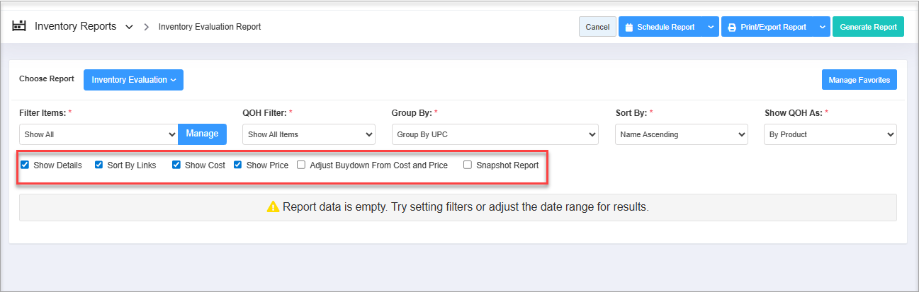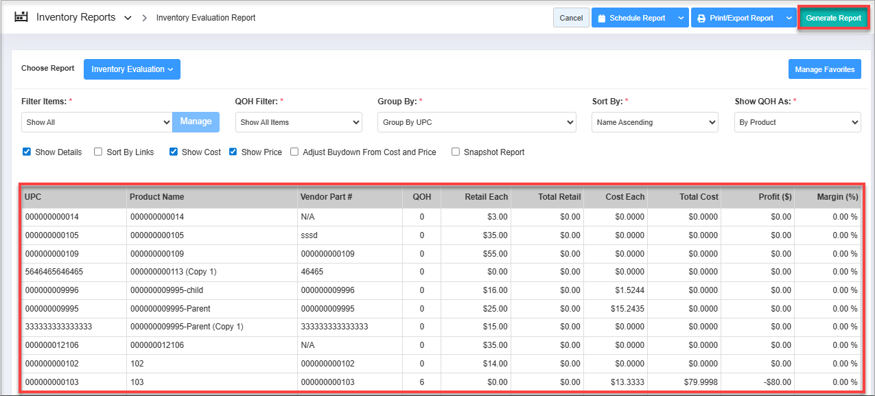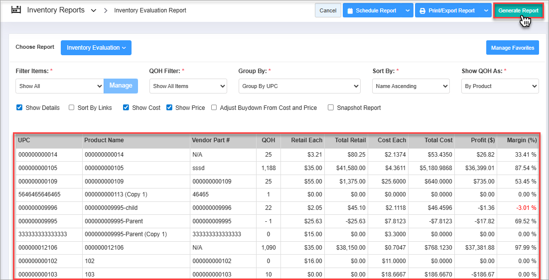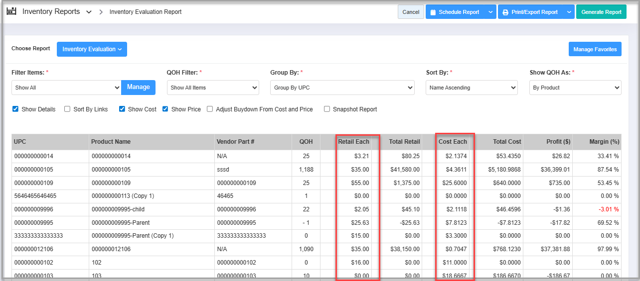 Before enabling the "Adjust Buydown From Cost and Price" checkbox, you can see the applicable cost and retail price for each product in the Inventory Evaluation Report.
