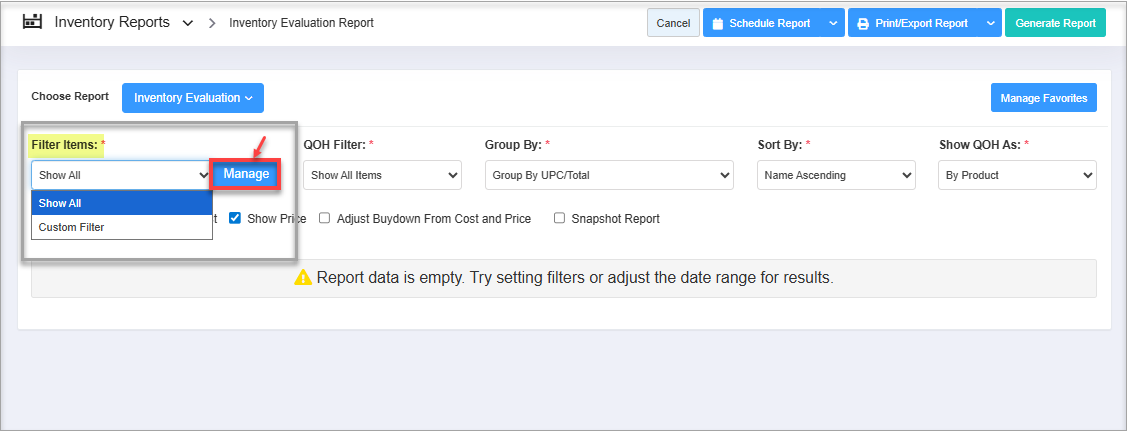 - Custom Filter: To customize the items for the report, you need to select the "Custom Filter" option. Once you select it, the "Manage" button will be enabled to set up the filters.