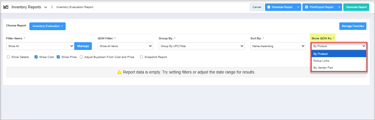 The Show QOH As filter lets you filter the report records based on three parameters: By Product, Rollup Links, and By Vendor Part. When you click the Show QOH As drop-down, the options appear, as Figure 4.5.1 shows.