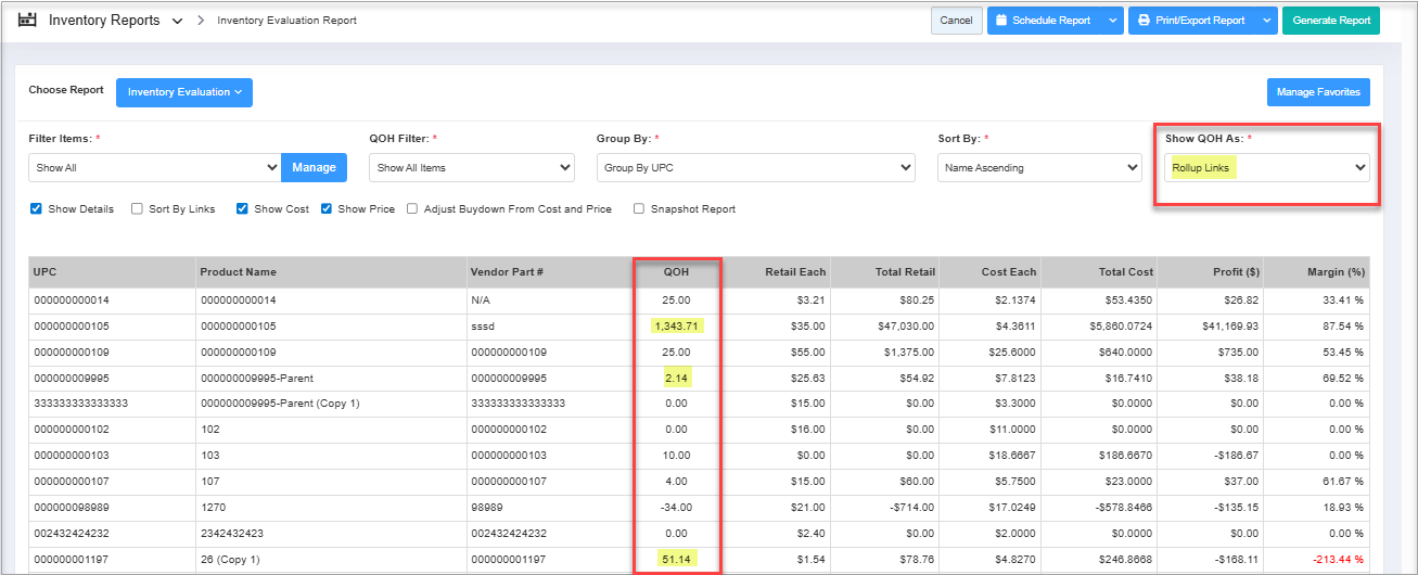 - Rollup Links: This filter will merge the related parent and child items to give you the total quantity on hand of the product in decimal format.