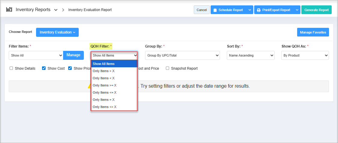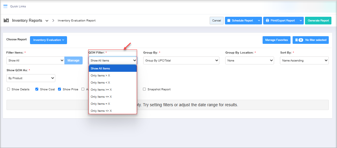 From the list of options, select the desired filter based on Quantity On Hand (QOH) as described below.