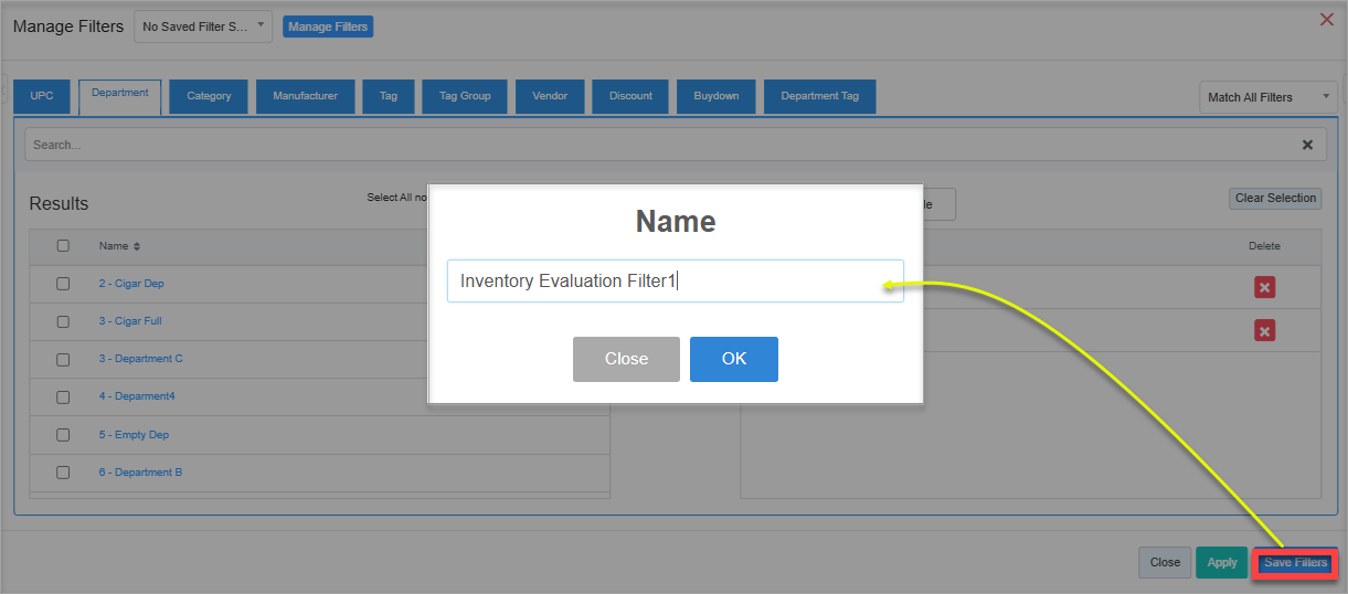 You can also save the configured custom filters for future use. By clicking the "Save Filters" button, a pop-up will appear to allow you to enter the name of the custom filter.