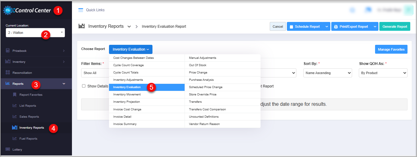 To generate the "Inventory Evaluation Report," follow the steps below. (See Figure 2.1 above). Enter the information in the fields and click on "Generate Report."