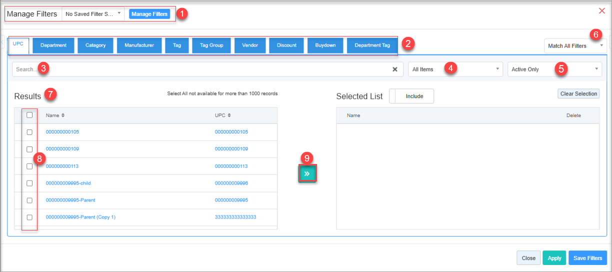 4. All Items: Use this drop-down to filter the Manage Filter screen data based on four parameters: All Items, Child Only, Parent Only, and Standalone only.