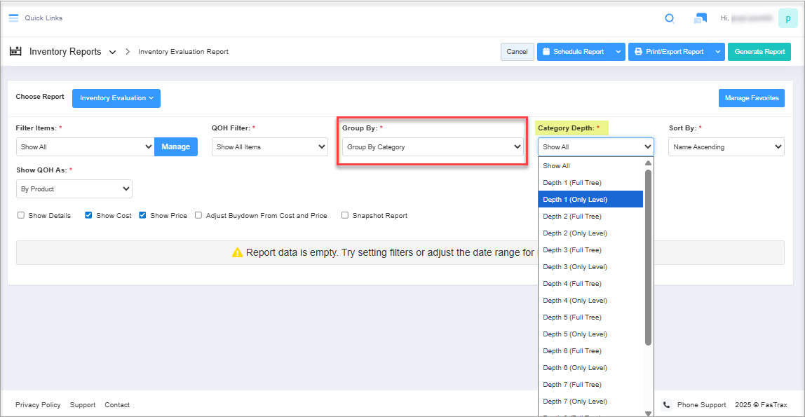 this drop-down option will be enabled. This drop-down option lists the level (depth) of the categories. So, by selecting the specific depth, the Inventory Evaluation report will display only the inventory data under the selected depth (level).