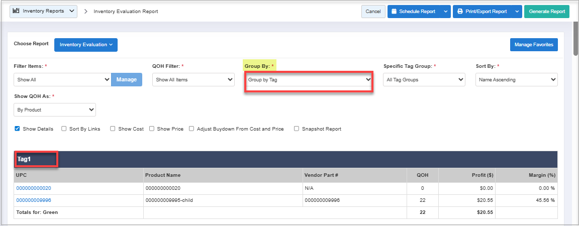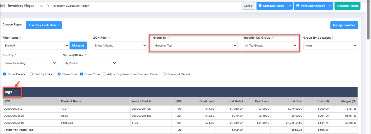 Therefore, the inventory data will be grouped in the report according to the tags inserted in the product details.