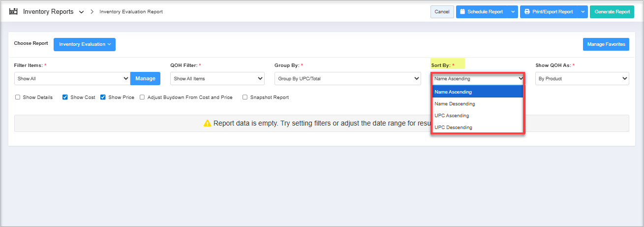 The "Sort By" option in the Inventory Evaluation Report screen allows you to determine the order in which the report data will be displayed. This helps users analyze information more efficiently by organizing it based on specific criteria. The available sorting options are: