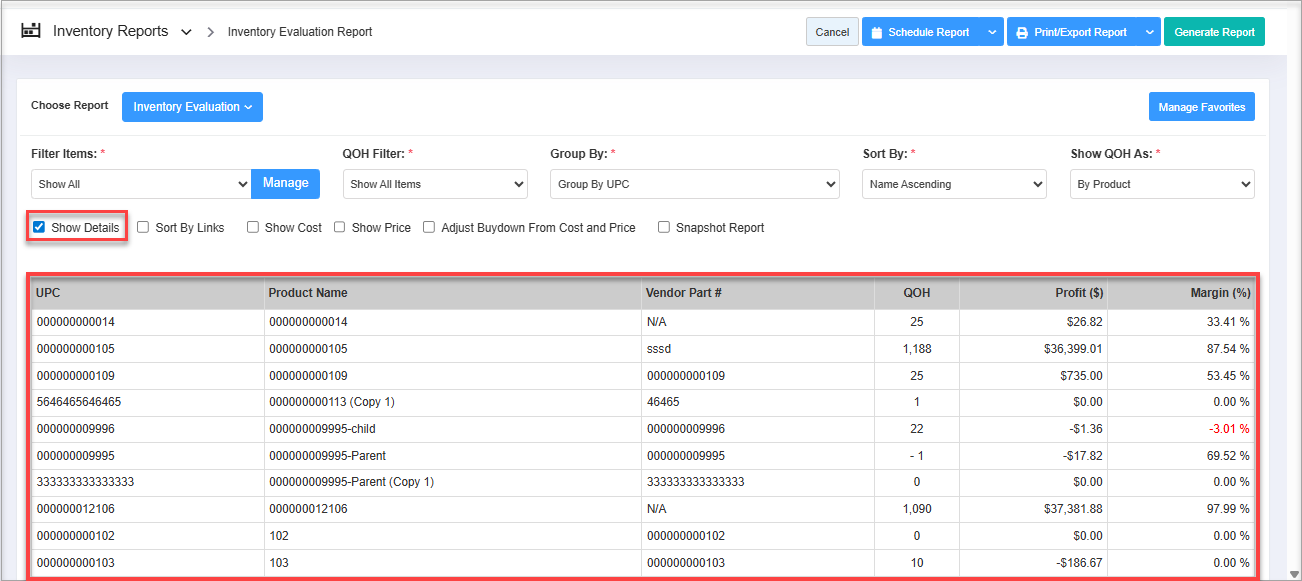 Tick the "Show Details" checkbox to display the products on the list. By ticking the "Show Details" checkbox and generating the report, you will see the products with extra details such as product name, vendor part, cost, price, etc. in the Inventory Evaluation report.