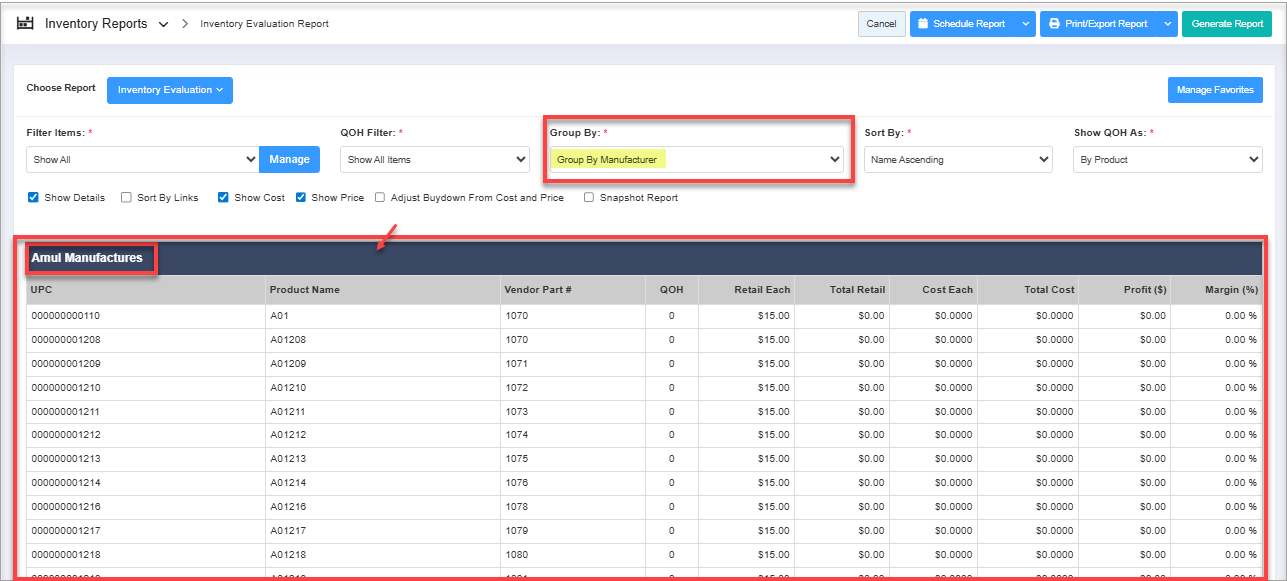 4. Group By Manufacturer: If you select "Group By Manufacturer," you will see the manufacturer-specific inventory data in the report.
